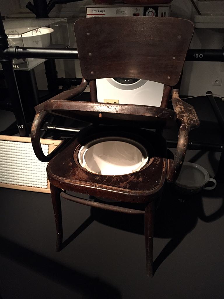 Seveda pa ni vse tako črno in je med drugim možno videti cel kup zanimivih rekvizitov, med njimi tudi zabavnih. Tudi tole starinsko WC školjko (?), ali pa mogoče WC stol, katerega uporabnost je sicer zadoščala svojemu namenu, je pa po opravljeni potrebi verjetno bilo kar nekaj dodatnega, nečednega dela. Vesel sem, da mi tega ni potrebno vedeti.