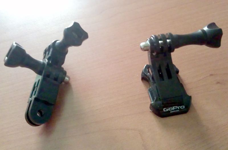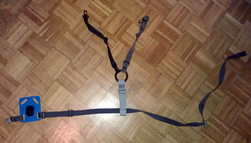 Zraven smo dobili še eno ohišje, ki je vodoodporno, vakuumsko podnožje, ki ga je mogoče pritrditi na razne površine in nekaj konektorjev, ki služijo za namestitev in nastavitev želenega kota. Vakuumski nastavek naj bi bil zelo zanesljiv. Morda bomo videli v kratkem, ko bo testiran na krilu aviona hehe. Za razne namenske nastavke pa bo treba ponovno seči v denarnico. Razni trakovi, nosilci, nosilci za na krmilo itd. Vse to se dokupi. Tomaž je naredil takšnega, ki se ga da pritrditi na čelado ali kaj drugega, kar s trakom. Ko sem malce testiral, sem opazil, da nikakor ne morem dobiti kadra, ki bi prikazal del “balance” in proge spredaj. Če sem ga pritrdil na čelado je bil previsoko in sem videl samo trail pred seboj. Tudi, če sem snemal v opciji wide, se ni izšlo. Kar sem potreboval je, pritrditev kamere na prsi. Tako bo vidna tudi balanca. In internet seveda nudi vse. Hitro sem izbrskal DIY video in se lotil dela. K sreči sem imel doma kar nekaj starih torb, tako, da sem imel zalogo trakov in priključkov. A veš onih, ki jih vidiš na kakšnih torbah itd. Tiste ki jih lahko priključuješ skupaj in to. Pa one, ki omogočajo nastavitev dolžine traku. No, te. Plastično podnožje pa sem naredil iz stare škatle za prvo pomoč haha (tista modra plastična zadeva). Razrezal torbe, šival in lepil, vrtal in brusil. In nastal nosilec za na prsi. Odrezal se je presenetljivo dobro! Privarčeval sem 50 eur. Seveda pa ne zgleda tako kul kot kupljena zadeva.