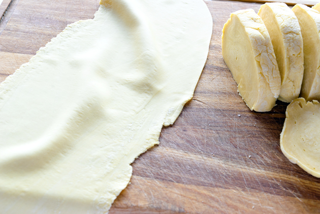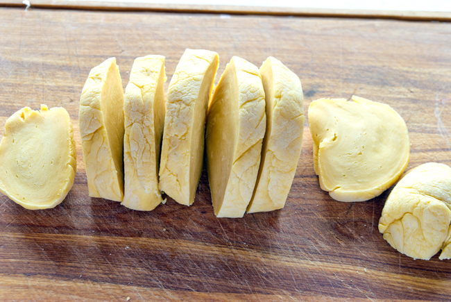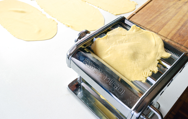 Torej, vzel sem 500g moke, 4 jajca, jih dobro umešal. Dobra receptura je, da uporabimo 250g gladke moke in 250g ostre. Moko sem dal na desko, naredil v sredini lep krater in vanj previdno zlil jajca. Potem je seveda nastala velika packarija. Na strani sem kupček zjebal in jajca so se vztrajno izlivala iz mojega hribčka moke. Nastala je stranska erupcija, nekako tako kot leta 1980 na gori St.Helen, ko je špricnilo po strani. Nekako mi je uspelo spraviti hitro vse nazaj skupaj. Ko se je vse lepo sprijelo, sem začel gnesti testo. Testo je precej trdo, kar je dobro. Gnesti ga je potrebno, dokler ne dobi lepega gladkega tona, je lepe rumene barve in ni zaslediti nobenih grudic. Uporabil domača jajca. Testo je bilo lepe rumene barve, takšne, da bi kar surove rezance jedel. Potem sem testo narezal na manjše konce in začel valjati. Super je, če lahko nastaviš debelino valjev. Najprej sem uporabil bol široko, testo nekajkrat prevaljal in nato zožil razmik med valji na željeno debelino. Ne vem kako je pri drugih mašinah, na tej je 5 ravno prav (za moj okus). Valjal in prepognil in še enkrat zvaljal, da sem dobil lepe, dolge, gladke rumene trakove. Potem sem trakove pustil 10 min, da se rahlo posušijo. Čas za izdelavo rezancev. Trakove testa je stroj čudovito spreminjal v odlične domače rezance. Ko sem končal sem jih pustil malce posušiti. Malo sem jih tudi pomokal in premešal, da se nebi sprijeli. Barva testenin je res čudovita. Občutek, ko jih narediš sam še lepši.
