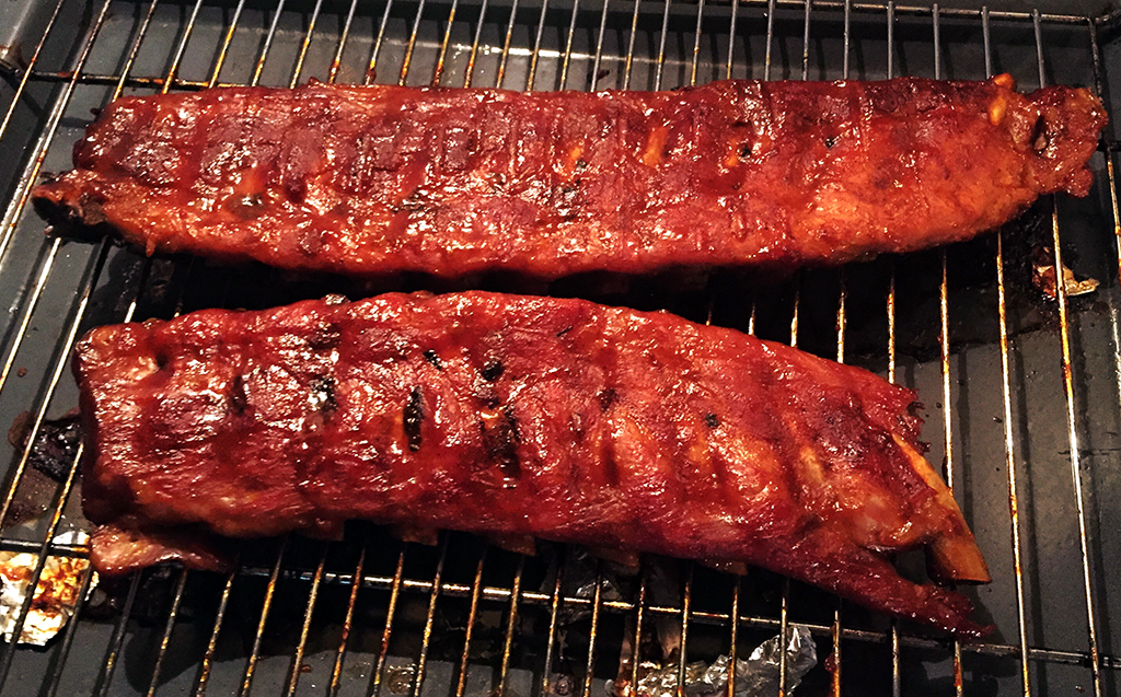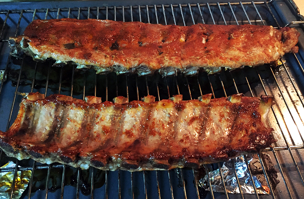 Rebra položimo na pekač oziroma mrežo. Najbolje na srednjo višino. Zavito v alu folijo pečemo dve uri. Po dveh urah jih vzamemo iz pečice in odstranimo alu folijo. Meso namažemo z bbq omako s katero nismo skromni. Temperaturo v pečici zvišamo na nekje 200 °C. Rebra – tokrat brez alu foljije! – položimo na mrežo in jih pečemo še nekje pol ure na 200 °C. Tako bo bbq omaka lepo karamelizirala in meso bo dobilo lepo hrustljavo skorjico, v sredini pa bo ostalo sočno. Seveda bo kar samo odstopalo od kosti! Po pol ure vzamemo iz pečice, pustimo stati nekje 10 minut in nato serviramo. Poleg paše kakšen dober, domači, pečen krompir. Ali pa zelenjava iz žara. Ali pa kar oboje. In pa seveda kozarec dobrega rdečega vina. Ali pa kar pir. :)