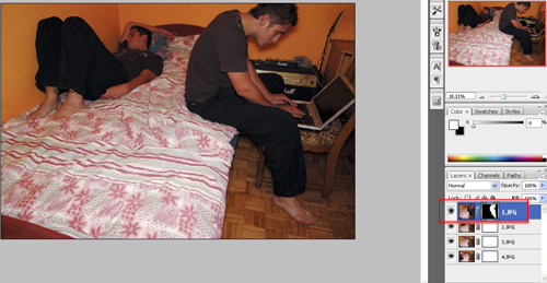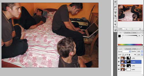 Na takšen način nadaljujemo tudi naprej, dokler nismo na eni sliki prikazali vseh želenih subjektov. Nadaljujemo s procesom prikrivanja in odkrivanja plasti. Subjekte pustimo vidne, okolico prikrijemo. Vse dokler ne pridemo do predzadnje plasti (Slika 6). Zadnja plast v bistvu sploh nebi potrebovala maske, ker se pod njo ne nahaja nobena plast. Izbiramo plast za plastjo. Če opazimo kakšne nepravilnosti se vedno lahko vrnemo na prejšnjo plast in določen del prikrijemo ali odkrijemo z barvanjem maske.