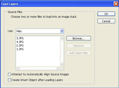 Ko smo naredili naše fotografije in smo z njimi zadovoljni, odpremo Photoshop. Vse slike, ki smo jih naredili moramo prenesti v Photoshop in jih spremeniti v posamezne plasti (Layers). Da se izognemo nevšečnostim, nam je Photoshop priskrbel odlično skripta, ki bo to za nas napravila samodejno. V Photoshopovi orodni vrstici izberemo File -> Scripts -> Load Files Into Stack…. Pojavilo se nam bo okno, izberemo gumb Browse in poiščemo mapo, ki vsebuje naše fotografije ter izberemo vse fotografije (CTRL+A). Izberemo OK in počakamo, da mašina zmelje.