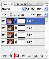 Najprej moramo vsaki fotografiji oz. plasti (Layer) dodati masko (Layer mask). Na spodnji sliki Slika 3 je z rdečo označen gumb Add layer mask s katerim dodamo masko. S pomočjo mask bomo naše subjekte klonirali.