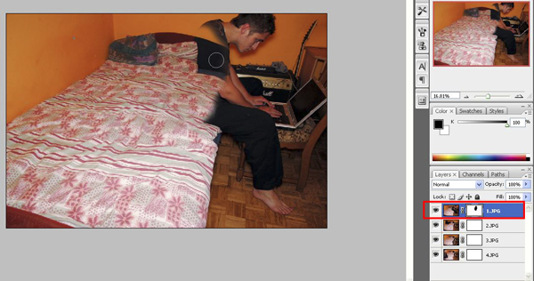 Ko smo nastavili čopič se prepričajmo, da imamo izbrano črno barvo. V seznamu plasti izberemo prvo plast in kliknemo na masko, tako da imamo le-to izbrano (Slika 3). S čopičem previdno in natančno barvamo naš subjekt (Slika 4). Ta bo pod našim čopičem izginjal. Morda se vam to zdi čudno, ampak kar nadaljujte, subjekt natančno prebarvajte oziroma izbrišite.