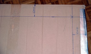 2.     Izrezali bomo obe stranske in sprednjo stranico. Prav tako bomo izrezali tudi zgornjo stranico katera bo predstavljala vir svetlobe.. Zadnja stran škatle (zadnja stranica) naj ostane cela in je ne režemo, ker bomo preko nje kasneje pritrdili belo ozadje. Preden pričnemo z rezanjem najprej izmerimo in označimo našo škatlo. V tem primeru sem na stranskih in sprednji stranici pustil 6 cm, zgornji pa 4 cm roba.  Izmerimo in zarišemo kar se da natančno.