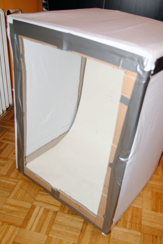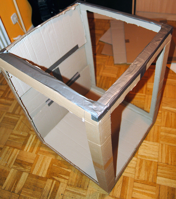 Tkanina bo omogočila mnogo mehkejšo svetlobo in s tem veliko manj in mehkejše sence. Ko smo stranice izrezali, jih previdno namestimo na škatlo. Poizkušamo se jih kar se da napeti a pazimo, da s tem ne povzročamo preveč pritiska na škatlo. Ne pozabimo, da gre vendarle za karton :). Pri pritrjevanju uporabimo lepilni trak. Tukaj se pokaže uporabnost power tape-a in njegova izjemna lepilna moč. Za občutek sledite spodnji sliki.