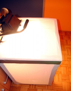 Kako boste namestili reflektor nad lightbox je vaša stvar. Za demonstracijo sem ga namestil na polico in ga pritrdil  nekaj lepilnega traku in ga obtežil. Lahko uporabite brezžične ali žične sprožilce za vaš fotoaparat in reflektor držite nad lightboxom, lahko si izdelate tudi stojalo za reflektor. Sam sem si naredil tudi stojalo, ki omogoča nastavitev višine reflektorja. Ker je zgornja stranica iz belega blaga, bo svetloba mehka in bo rezultat podoben kot pri softboxu.