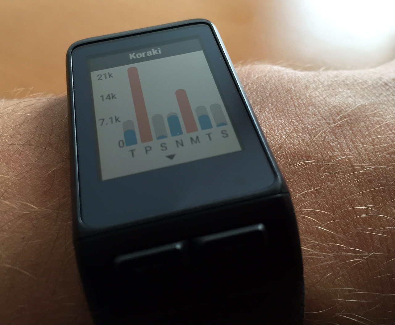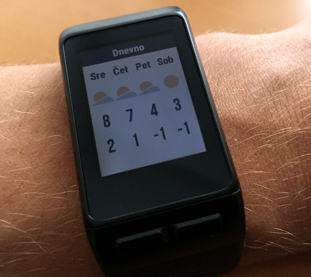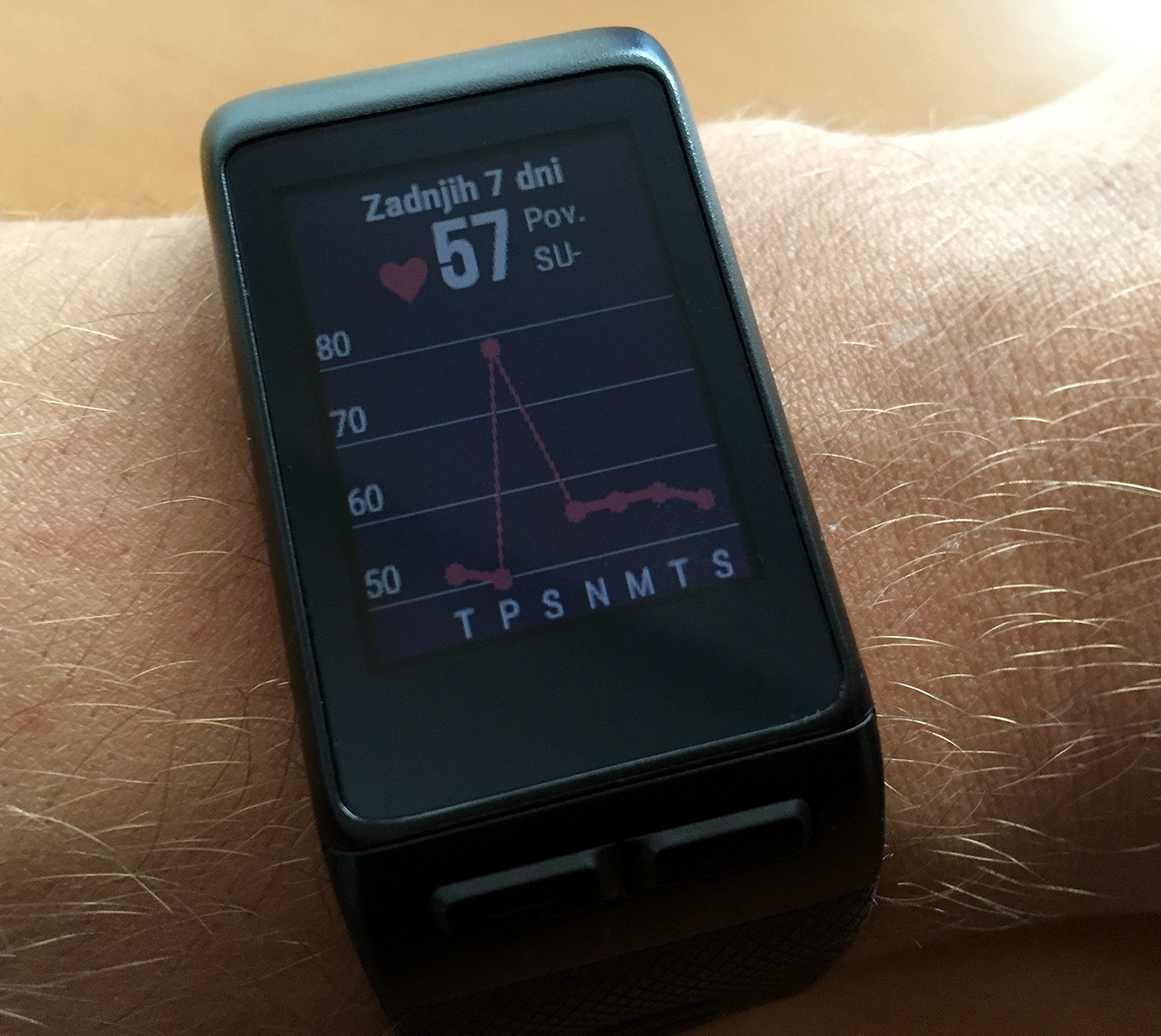 Tako pa lahko vidimo tedenski grafični prikaz na uri. S klikom na ekran seveda dostopamo do podmenujev, ki nam podajo še več podakov.