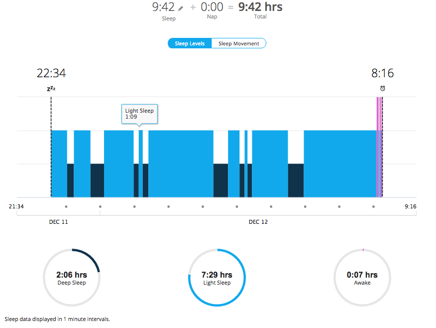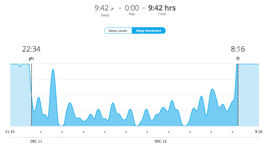 Takole naj bi spal dvanajstega decembra. Vidi se, da je bil vikend kar naporen – čas zaključkov – in je bilo potrebno notri spraviti nekaj dobrega spanca. 9 ur in 42 minut je kar zavidanja vreden spanec. Tega se zavedam še posebej dobro zato, ker sem nekdaj s spanjem imel težave.