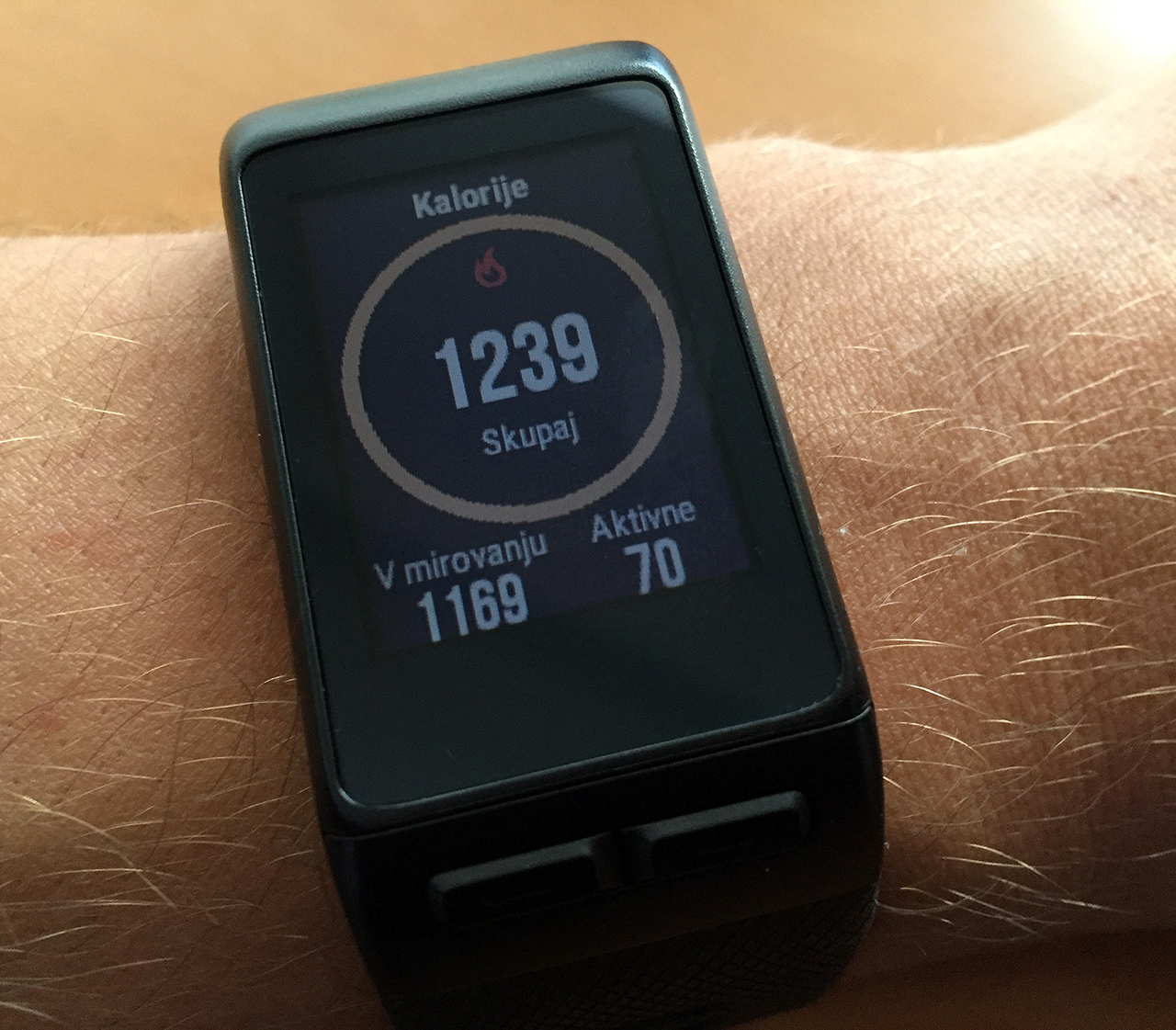 Spremljamo lahko tudi porabo kalorij. Garmin loči celo med tistimi, ki smo jih porabili med vadbo in tistimi, ki niso bile porabljene med vadbo. Koliko je to natančno, žal, ne znam povedati.