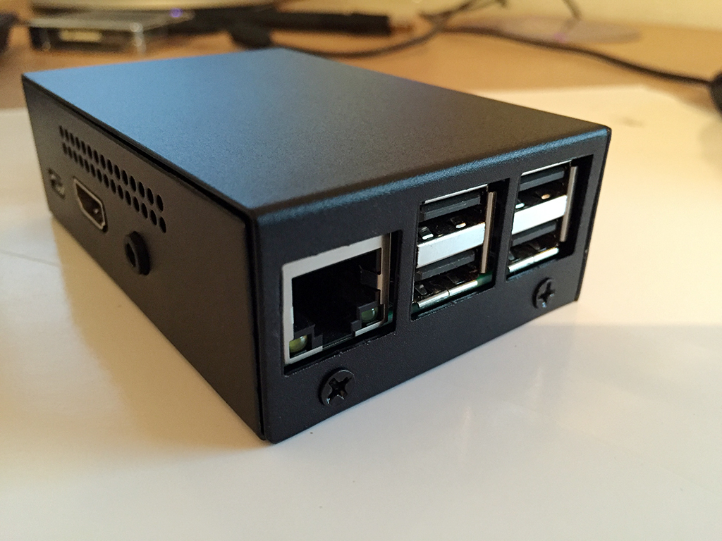 Raspberry pi2 je majhna, skromna in precej zmogljiva igračka, ki z lahkoto servira filme v 1080p ločljivosti oziroma poganja medijski sistem kot je Kodi. Je tudi izredno poceni. Verzija 2 ima za svojo velikost presenetljivo pestro konfiguracijo. Poganja ga Broadcom BCM2836 Arm7 Quad Core procesor na frekvenci 900MHz. Premore 1GB rama, 4 USB porte, 1 HDMI izhod, micro SD port in 10/100 ethernet port. Nova verzija naj bi prav tako omogočala možnost priklopa bistveno močnejših porabnikov na USB porte. Napaja se preko micro USB konektorja. Priporočen napajalnik naj ima 5V napetosti in do 2A toka. Velik plus je tudi, da nima gibljivih delov kot so ventilatorji in disk kar pomeni, da je povsem neslišen in nemoteč. Zanj se dobijo super aluminijasta ohišja z vgrajenimi hladilnimi kanali. Sam sem naročil alu ohišje, ki je vidno na spodnji sliki.