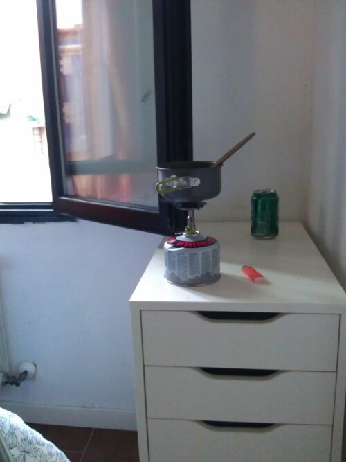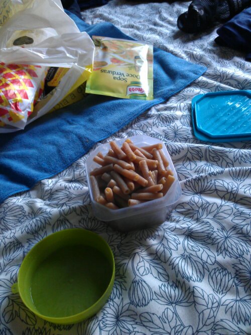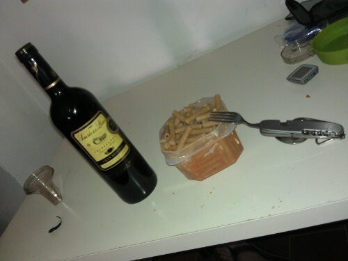 Iskala sva trgovino z kamp in pohodniško opremo. Našla sva jo. In ne boste verjeli. Dobila sva plin! Ja! Danes se bo jedla topla hrana! Juhuuu! Takoj sva skočila v trgovino po makarone, omako, juho, vino … V sobi sva si pripravila pravo pojedino. Vino je bilo odlično. Najedla sva se do polno sitega.