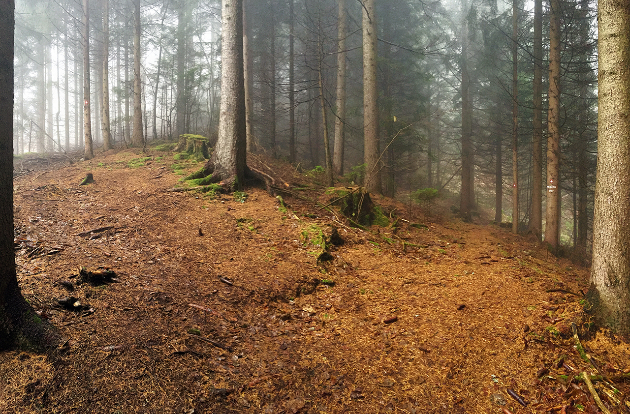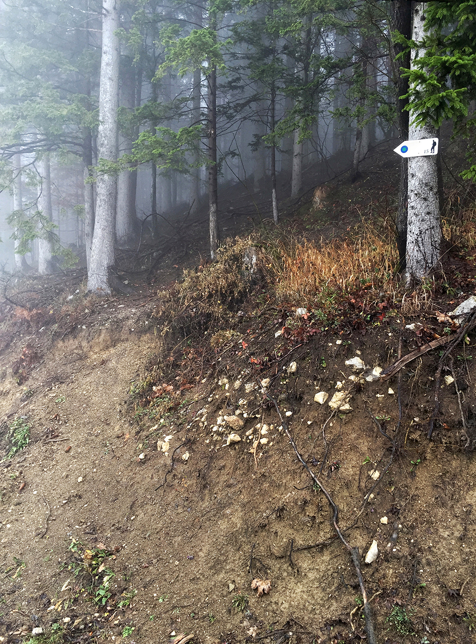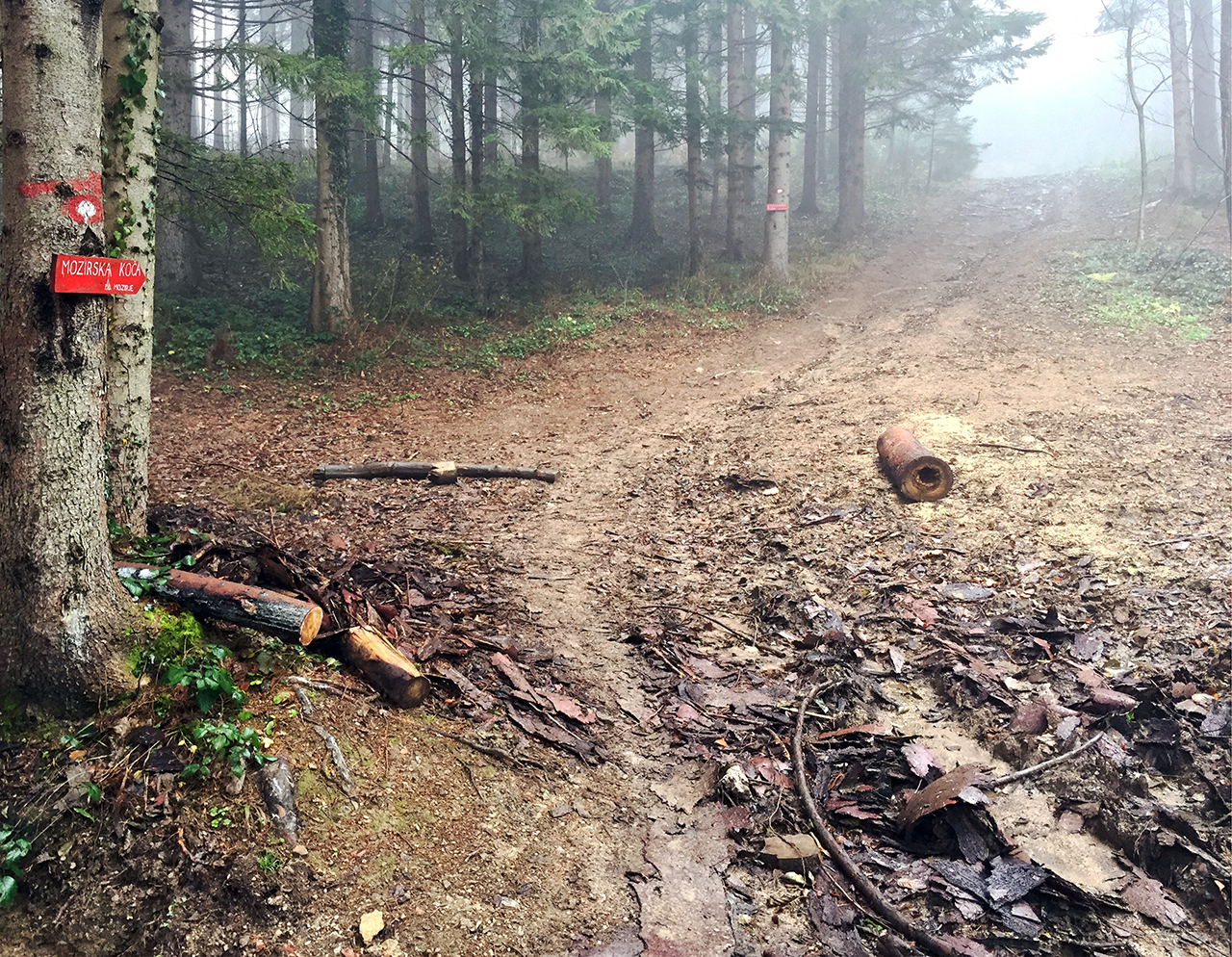 Iz asfaltiranih in širokih gozdnih cest se nato zavije na precej strmo in ožjo gozdno pot. Na momente se je zdelo, da je količina blata z nadmorsko višino eksponentno naraščala. Pot pa je sedaj tudi malo bolj “zategnila” v lepe strmine. Malo višje je bila kar močna poseka drevja in verjetno se je posledično izgubilo nekaj markacij. Pot je na trenutke precej slabo označena. Celo do te mere, da sva se v nekem trenutku malo izgubila. Kasneje sva srečala prijaznega gospoda, ki je po naključju bil markacist. Strinjal se je, da je označba slaba in dodal, da mu je to omenilo že kar nekaj ljudi. Obljubil je tudi, da bo v društvu omenil in se bo zadeva uredila.