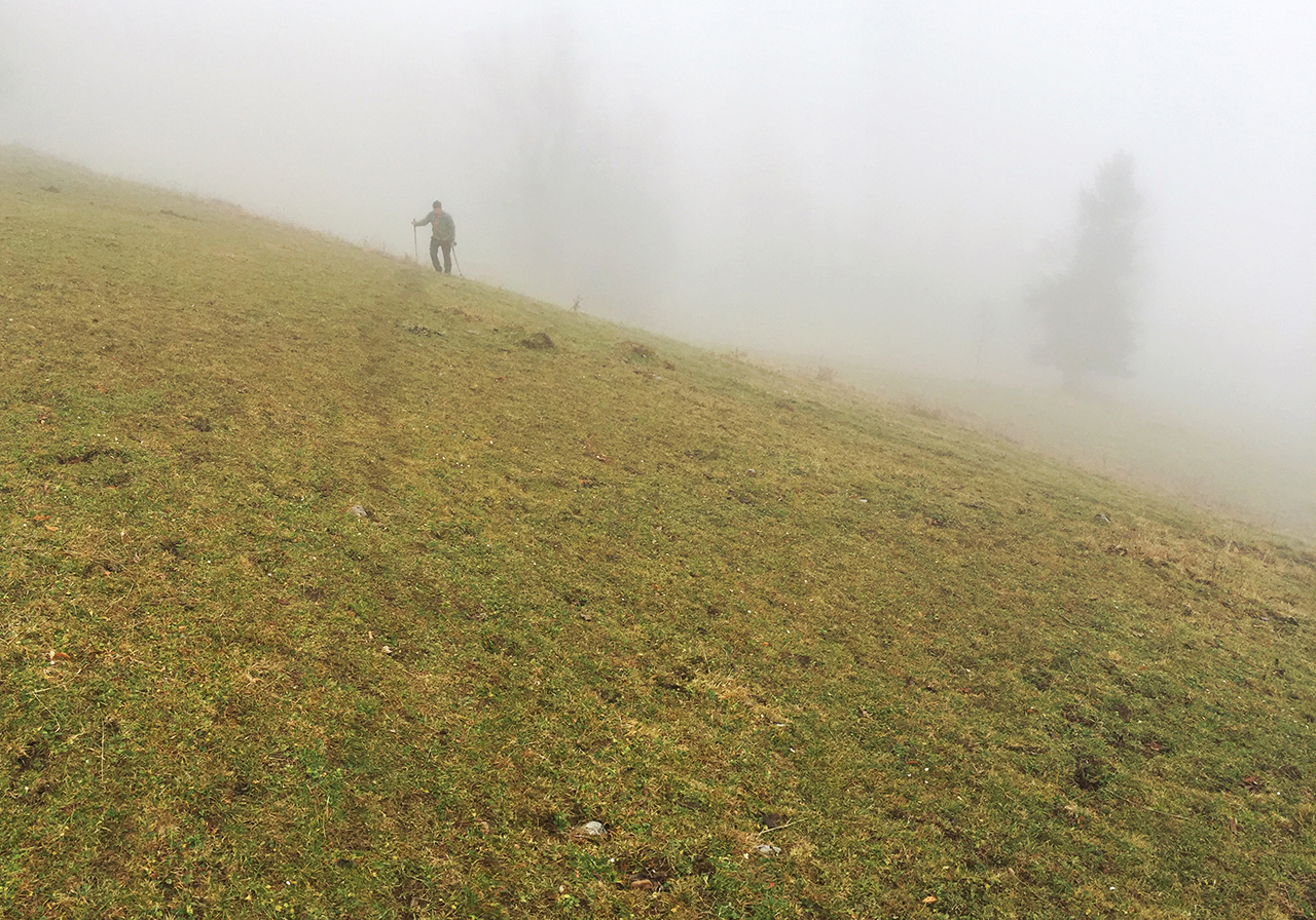 Asfaltirane ceste je bilo kmalu konec in iz asfalta sva zavila v brutalno blato. Na spodnji sliki je dejansko še precej zmerno napram razmeram višje, bližje koči. Teren je bil na nekaterih odsekih drsališče in malo me je zaskrbelo, da bom dosti na riti. Za v hribe vedno obujem visoke planinske čevlje, nekaj dni nazaj pa sem dobil robustne tekaške copate Salomon Speedcross 3 o katerih sem prebral kar nekaj dobrih stvari. Ker sem pričel ponovno s tekom, in sedaj rad tečem tudi po kakšnem trailu, pa še zima je skoraj tu, sem potreboval nekaj močnejšega, toplejšega in težje premočljivega. Torej, copati so se obnesli vzorno. Profil na podplatih je izvrsten in ne pusti na cedilu, nudi super oprijem in stabilnost. Blato, korenine, skale, listje … čez vse je šlo brez kakršnihkoli težav, brez drsenja. Brez palic. Komaj čakam, da jih poskusim še na kakšnem trail teku.
