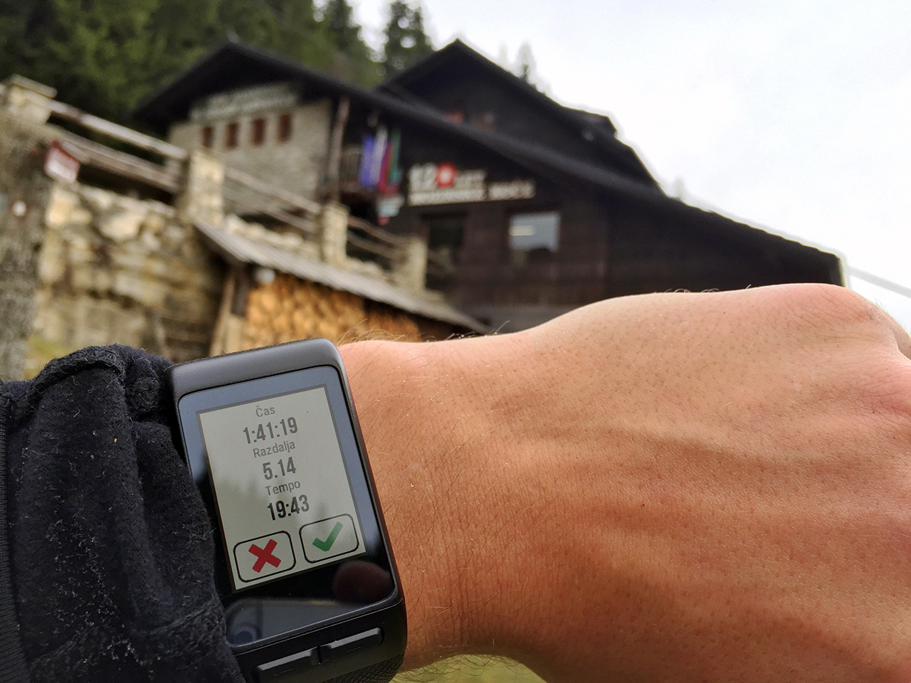 Cilj. Prispela sva v času 1 ure in 41 minut. Torej slabih dvajset minut pred časom, ki ga je navajala tabla spodaj, in 35 minut pred časom, ki ga navajajo na hribi.net. Prešvicana močno.
