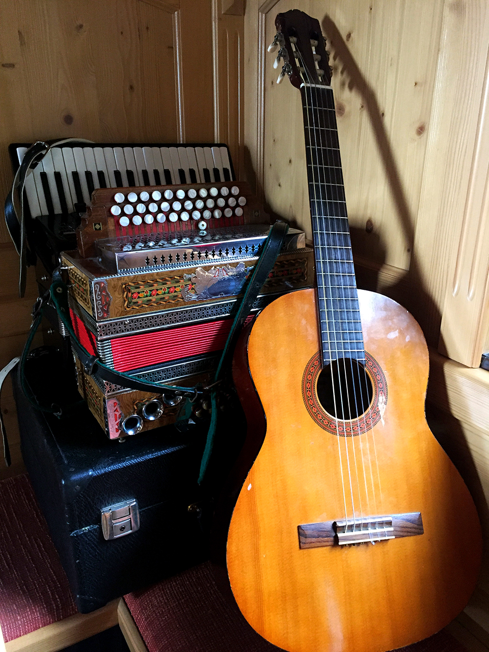 Na poti ven, pa naju je prijazna skrbnica povabila, da lahko tudi kaj zaigrama. Vsakemu, ki pride na kočo je na voljo kitara, frajtonarica ali pa klavirska harmonika. Obljubil sem ji, da morda ob kakšnem drugem obisku, ob drugi priložnosti, predvsem pa v drugem agregatnem stanju. Rekla je naj se še vrnemo, ubogal jo bom.