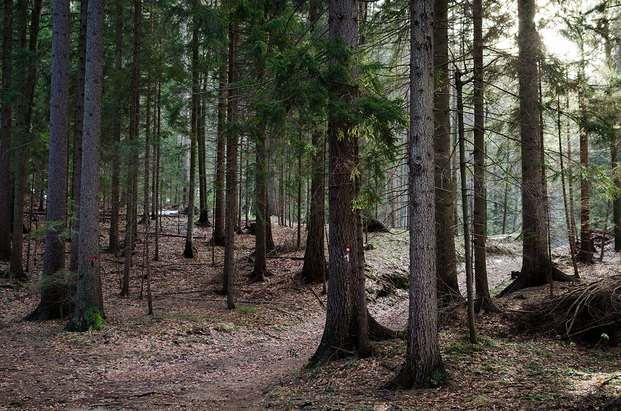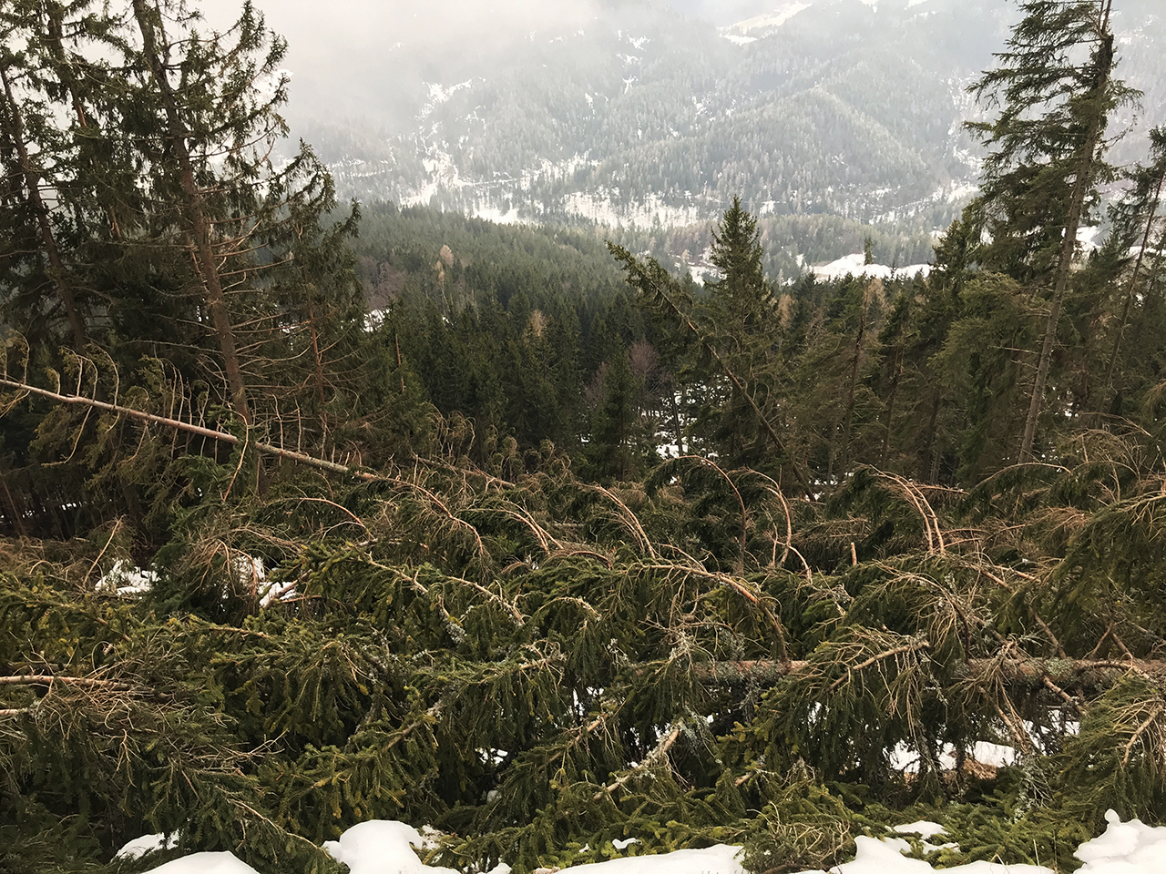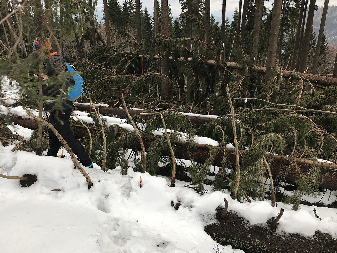 Ta zapis sem začel z dejstvom, da je bil to eden najtežjih pohodov. Da objasnim. Pot nazaj je bila tako samoumevna, da sva se začvekala in nehote ignorirala table, ki vodijo nazaj dol. Tako, kot da hodiva tod okoli vsaj trikrat na teden. Potem na enkrat Davor omeni, da je nekaj čudno. Jep, res je čudno. Zajebala sva kar precej višje v hribu, ampak nima veze. Na plan potegne telefon in na Google Maps hitro najdeva alternativo. Tamle čez gozdno pot in malo čez gošo, potem se pa pot združi s pravo potjo. To je sicer vse res, ampak nisva pa vedela, da je brutalno vetrovje, ki je nekaj tednov prej lomilo, presenetljivo groteskno pohabilo gozd. Pot je ponekod zaradi nametanega drevja in vejevja, bila popolnoma neprehodna. Malo pod smrekami, malo nad njimi, malo okoli njih v buralen klanec. Kmalu pa sva bila predaleč, da bi se splačalo nazaj.