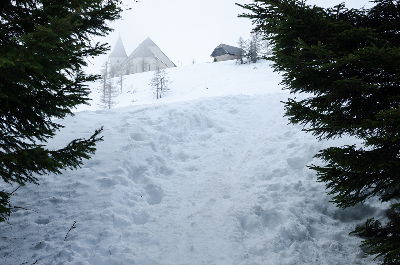 Tukaj sva se ustavila in ko je Davor iz torbe potegnil dva sendviča – spet primerjava, spominjala sta na tiste iz serije Komisar Rex – se kljub temu, da nisem bil lačen, sendviča nisem branil. Ob vsem kompliciranju človek spozna, da je največja lepota v čisto preprostih stvareh; to je lahko čisto navadna kajzerica z nekaj rezinami Polike, popolno minimalistično, ampak prekleto zadovoljivo. Še posebej po nekaj napora. Gozdovi tukaj so naravnost čudoviti, sneg vse skupaj samo še dodatno začini in naredi mistično. Od tod dalje pa ni več daleč do vrha. Kmalu se bo prikazala znamenita cerkev sv. Uršule. In pazi to! Ta cerkev je z 1678 metri nadmorske višine najvišje ležeča cerkev v Sloveniji. Še več; če gre zaupati Wikipediji, potem je morda celo ena najvišje ležečih cerkva v Srednji Evropi!