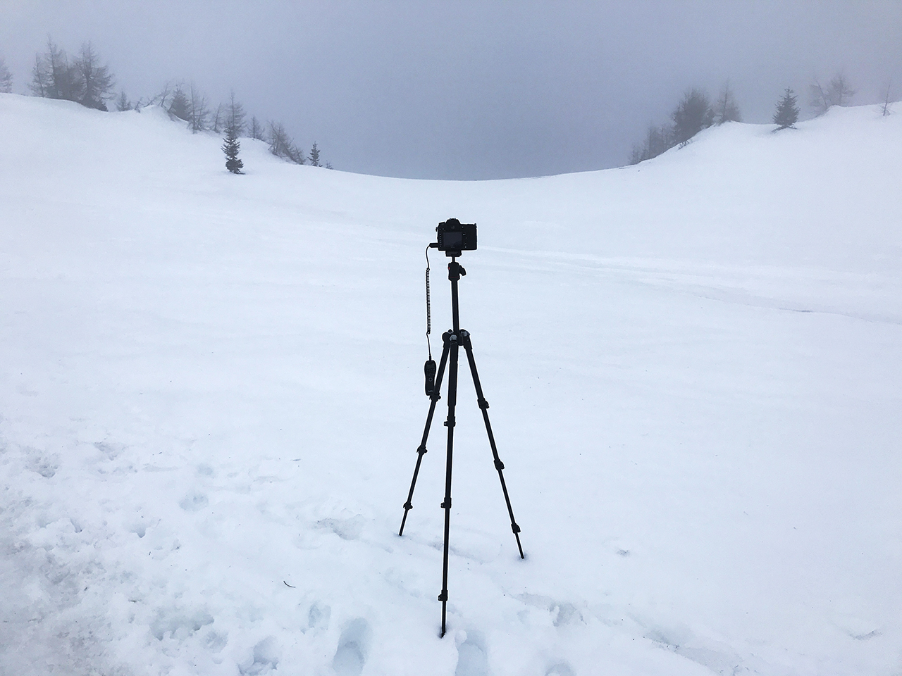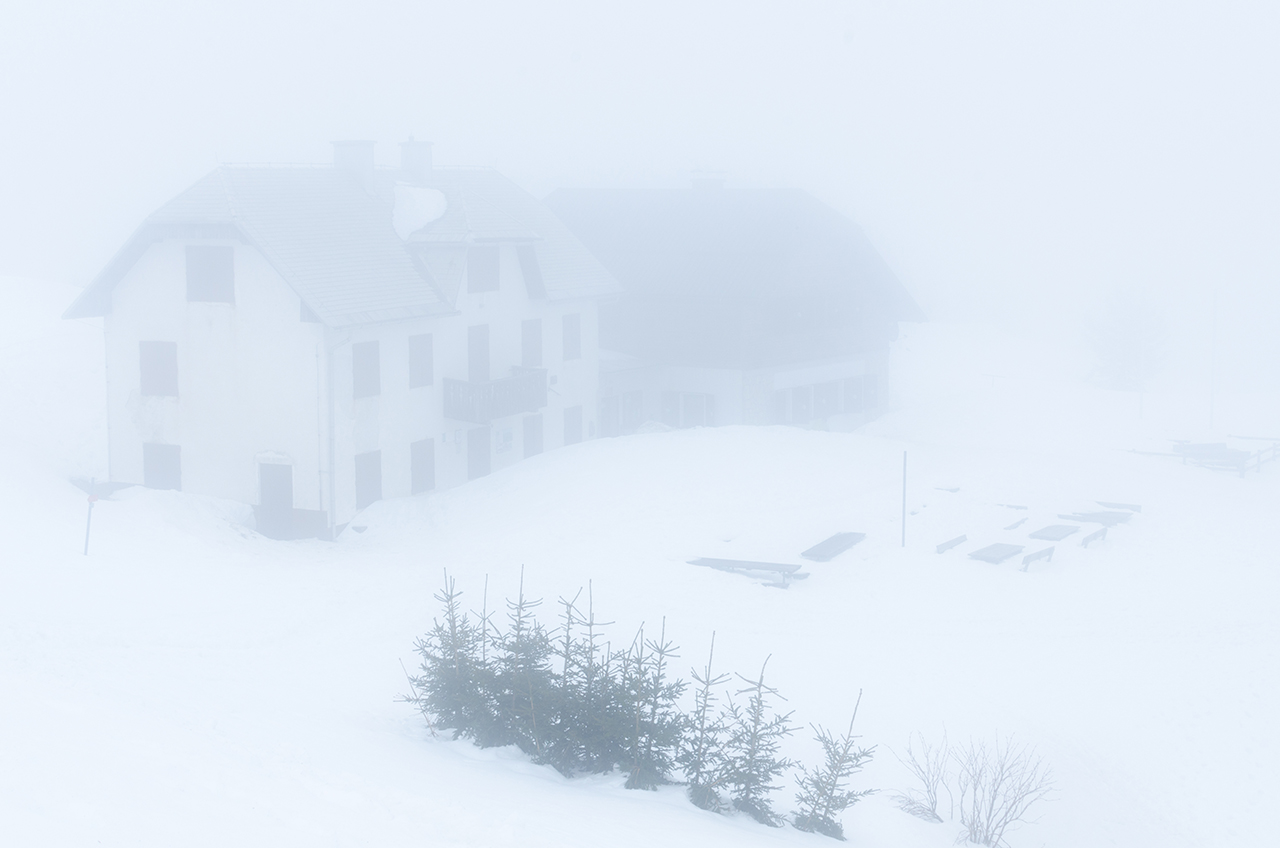 Malo pod uradnim vrhom sem zagledal super kompozicijo za fotografijo. Vse okoli megla, malo nad lepo krivuljo pa se je odpirala jasnina, ki je gledala proti Avstriji in njenim goram (vsaj mislim, da je bilo proti Avstriji). In seveda Murphyjev zakon. Takoj, ko sem postavil stativ, nastavil aparat in vse potrebno, se je vse popolnoma zaprlo in se kljub čakanju ni hotelo več odpreti. Po kakšnih desetih minutah sem iz spoštovanja do prijatelja obupal in krenila sva do vrha. Ko sva se vračala nazaj je bilo v daljavi videti, da se je spet odprlo. Ko sem postavil aparat in vse potrebno, se je zaprlo. »Kurc gleda!«, ne bo me tale oblak zdaj zajebaval, in sva šla v kočo.