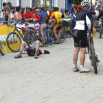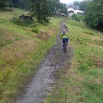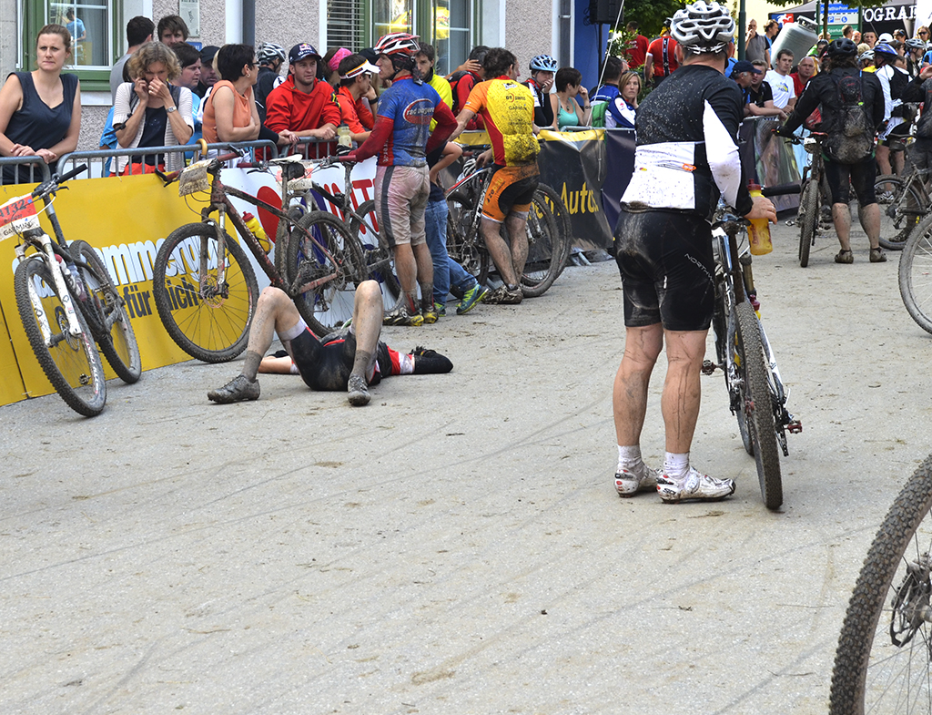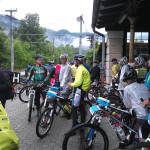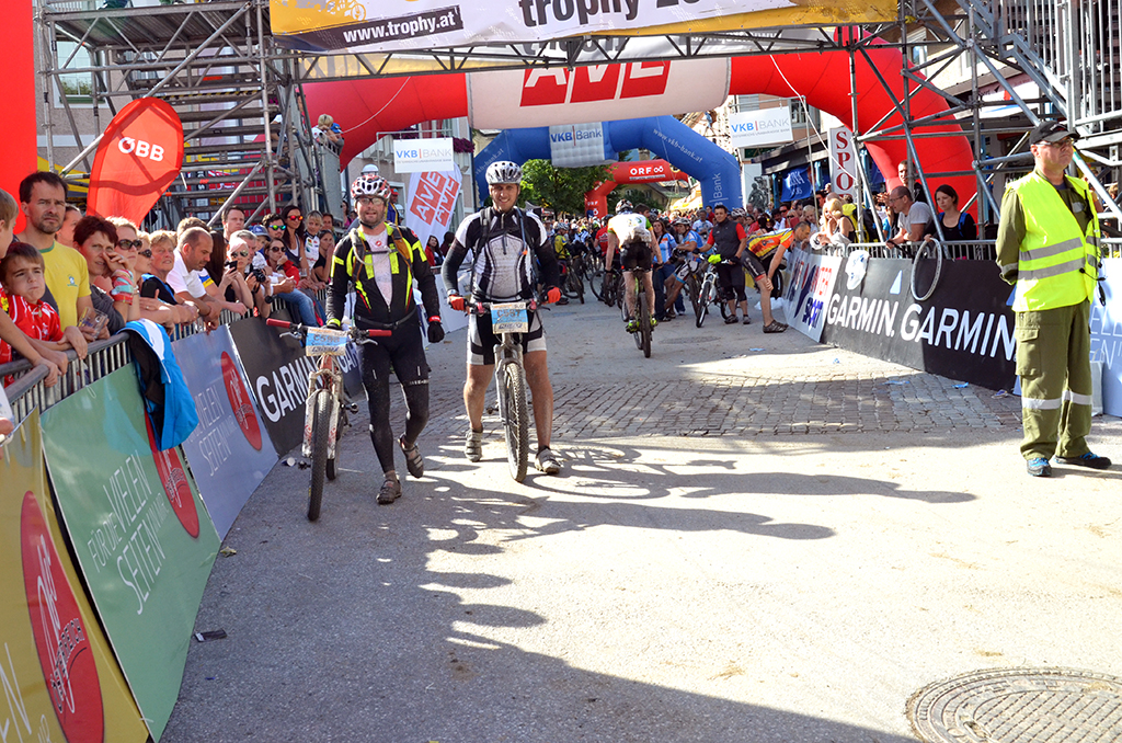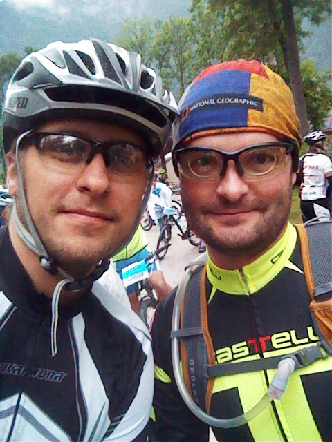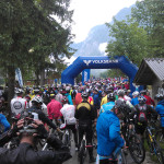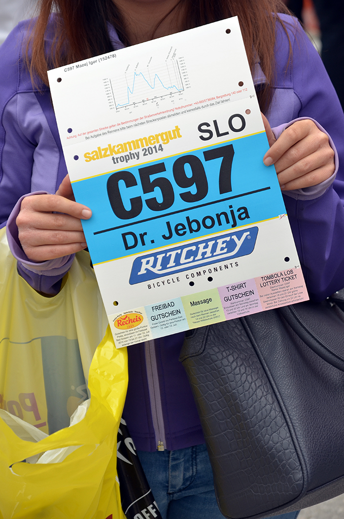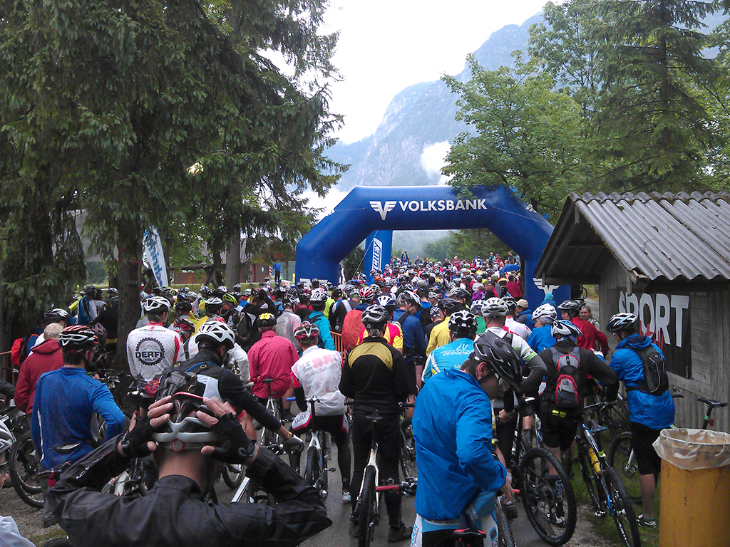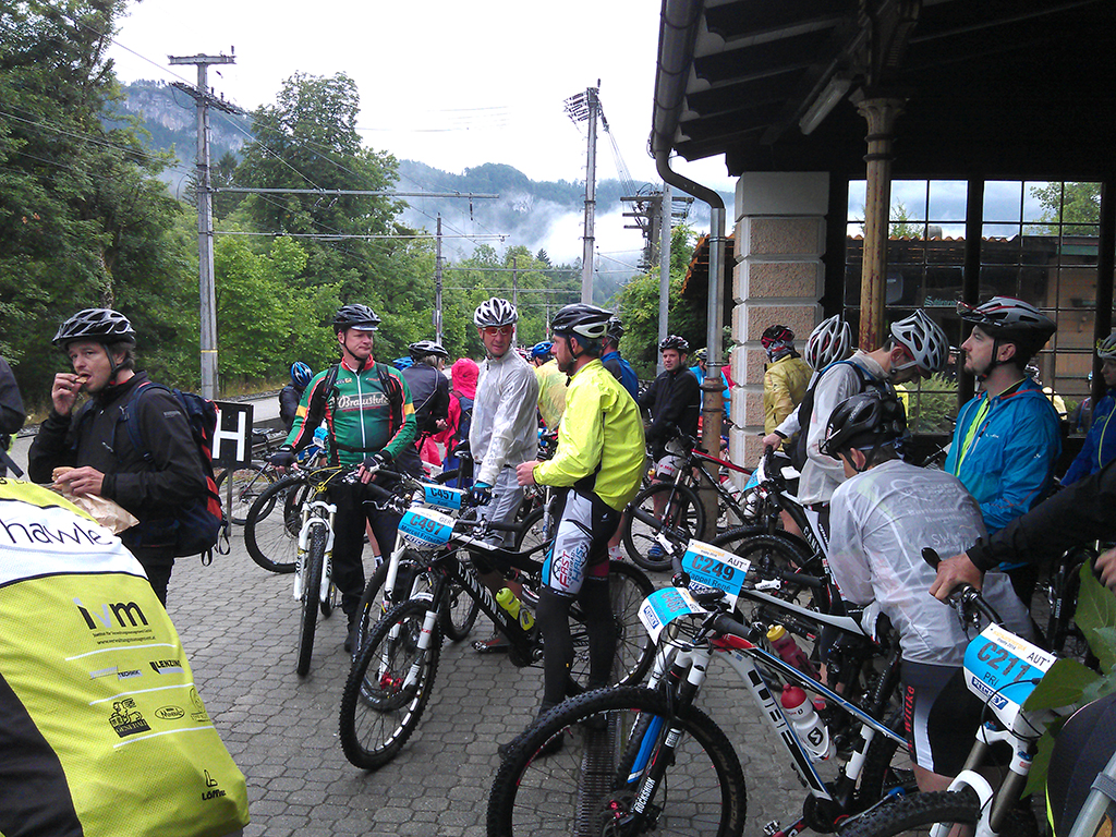 Pa je mimo. Cilj je bil dosežen. Prevoziti celotno progo C. 76 kilometrov, 2446 višinskih metrov. Prevozila sva jo v 6 urah in 57 minutah. Čas ni bleščeč, a tokrat cilj ni bil bitka s časom. Vzdevek na mojem startnem kartonu je bil kar presenečenje :D. Mislil sem, da bodo napisali ime in priimek, uporabili pa so vzdevek za katerega sem mislil, da je nepomemben hehe. V petek smo prispeli v prijeten kraj Bad Goisern in takoj je bilo čutiti čudovito vzdušje, ki ga je ustvarjalo stotine kolesarjev. Vreme je kazalo, da bo šlo na bolje, deževalo ni. Vzdušje je bilo sproščeno. Potem pa zvečer slaba vremenska novica. Dež z možnimi nevihtami. Obšlo me je malce slabe volje. Tudi spanec je bil zelo bogi. Nekaj je prispevala trema, nekaj dejstvo, da ne ležim v domači postelji in nekaj Davorjevo smrčanje :D. Zaspal sem nekje ob 4 zjutraj. Start je bil ob 10 zjutraj. Zjutraj so se vremenske napovedi izkazale za resnične. Dež, oblačno, blatno. Pred nama je bil ne več toliko privlačen izziv. Resnično si nisem želel voziti v takšnih razmerah. Po zajtrku na vlak in proti startu.