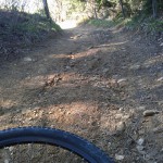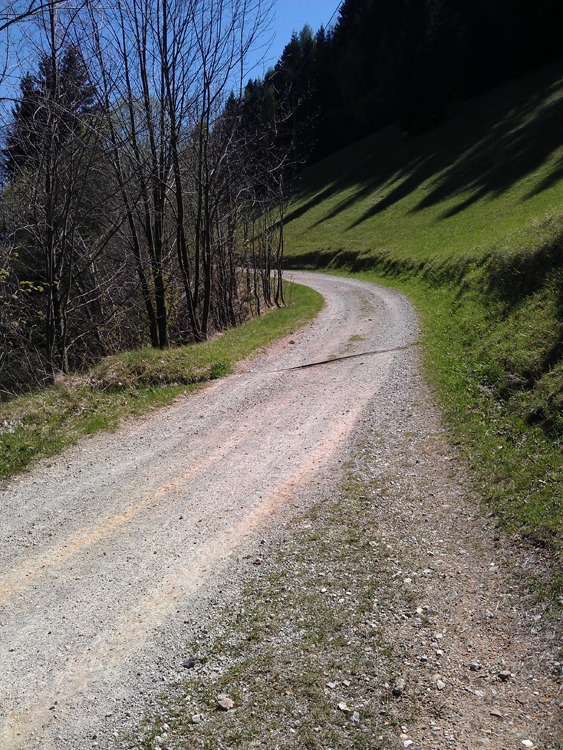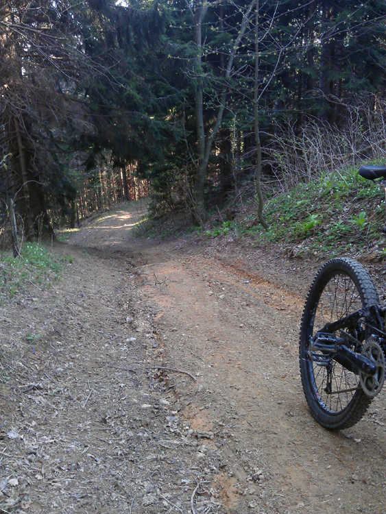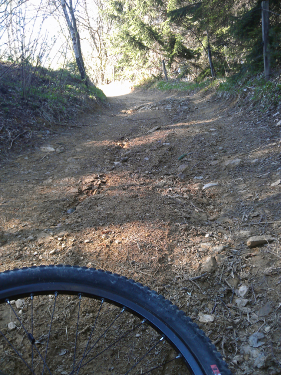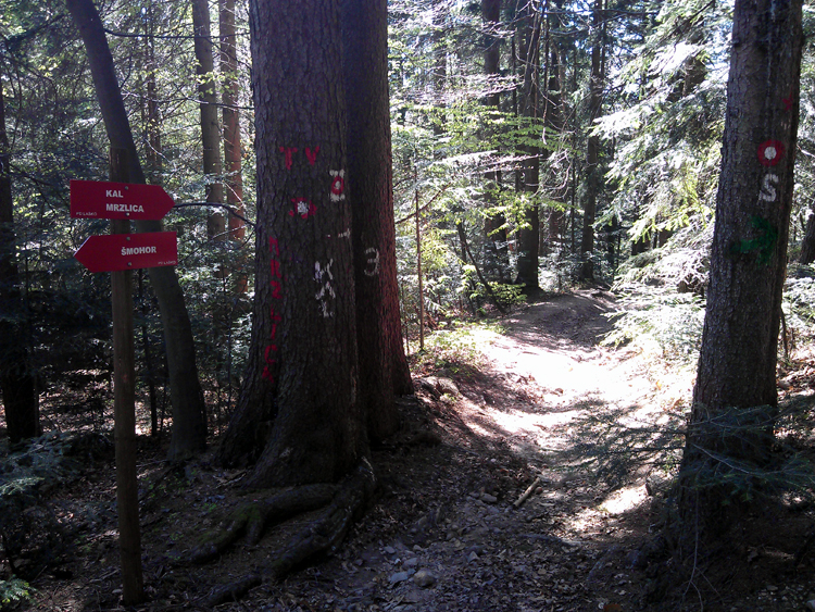 Torej, pot je potekala iz Petrovč pa do Šmohorja – 787m. Pravzaprav ne do vrha Šmohorja ampak malo naprej od onega “ta hudega” klanca, ki poteka po asfaltu. Če boste šli na Šmohor, boste vedeli kateri klanec mislim. Na koncu klanca zaviješ levo in prideš do križišča, ki vodi na tri možne poti. Vidiš lahko tudi kapelico. Levo te kaj kmalu čaka vrh Šmohorja, naravnost ne vem, desno pa je prava pot, če želiš na Kal – 985m. Do Šmohorja je pot mešana a nezahtevna. Večinoma poteka po široki pregledni cesti, nekaj časa asfaltirani in potem makadam. Pravzaprav precej dolgočasna. Ko krenemo proti Kalu, se pot nadaljuje po makadamski cesti. Peljemo naravnost. Pot je označena. Ko pridemo do smerokaze, nadaljujemo še naravnost cca. 300 metrov in na desno zagledamo odcep, ki pelje v gozd. Hočete sem. Pot je čudovita. Sledimo markacijam. Na nekaj delih pa pot postane precej težavna, koreninasta in skalnata. Nisem je zvozil v enem kosu, niti ne vem, če je to sploh možno haha. Nekaj delov sem kolo nosil. Ko prevozimo vso to gozdnato kolobocijo pridemo zopet na makadamsko cesto, ki pelje proti Kalu. Zavijemo levo. Pridemo do “znamenitega” Špajzerja, kmetija na poti pač. Zavijemo levo in pred seboj zagledamo strmo makadamsko, precej razrito pot. Pregonimo jo.