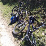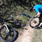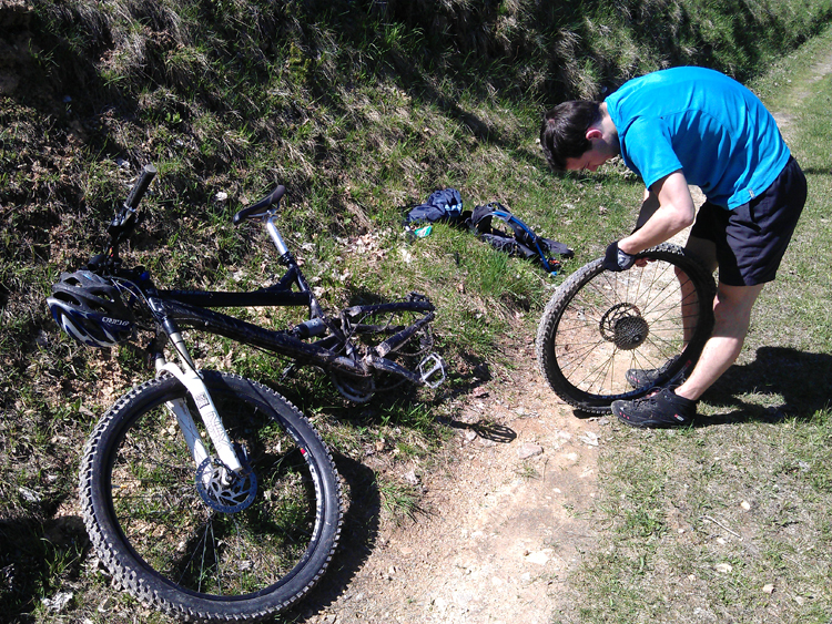 Malo naprej se je zadeva zakomplicirala. Tomažu se je predrla guma! Je rekel, da ima s sabo flike in pumpo. Takoj sem se zavedal, da sem debil, ker s sabo nikoli ne nosim teh zadev in, če bi nekje sredi gozda prišlo do takšne situacije, sem v pizdi. Razdrl je gumo in pričel pumpati zračnico. Pumpal je in pumpal in nič napumpal. Zanič pumpa. Spet preklinjanje. Tuhtava kaj narediti. Posodim mu kolo in odpeljal se je do bližnje kmetije poskusit srečo, če imajo pumpo. Seveda je nimajo! In zopet me je rešil dragi prijatelj Bitenc. Janez, še enkrat hvala! Car si! Brez odlašanja je šel na pot do Špajzerja na pomoč. Prosila sva samo za pumpo. Prinesel pa je še sladoled, zračnico in pumpo. Haha. Zares legenda! Tomaž ga je šel čakat do Špajzerja kjer sta napumpala gumo in, ko je prišel nazaj do mene je bila guma spet prazna. Pogledal sem zračnico in ta je bila flikana neštetokrat, tudi plašči so bili že precej dokrajčeni. Hvala Bogu za novo zračnico, ki jo je dal Janez. Popravila sva zadevo in nadaljevala pot.