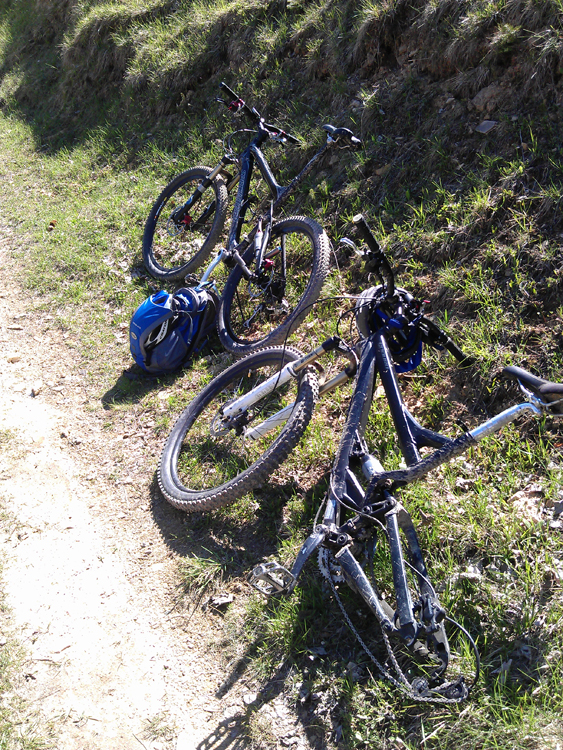 Pot se nadaljuje naprej po makadamu nakar pridemo spet do križišča. Smerokaz Kal kaže v desno smer a je zelo zavajajoče. Če zaviješ takoj desno si zašel iz poti. Potrebno je na desno v spodnjem ovinku. Potem spet dolgočasen asfalt in še nekaj malega poti do koče na Kalu. Tu je padel štrudl. Za pir še ni bil čas. Kal nudi res čudovit razgled. Pot sva nadaljevala po gozdni cesti do Mrzlice – 1122m. Pot se začne za kočo na levi strani. Markirana je. Sledimo markacijam. Zares čudovita pot. Precej spustov navzdol. In to čudovitih. Pa še gužve ni bilo. Nato pridemo do travnika, vrh Mrzlice se že lahko vidi. Tisti oddajnik. Na travniku sva zavila desno in pot je spet vodila v gozd. Nekaj časa sva še lahko vozila a kaj kmalu to ni bilo več mogoče. Rinil sem kolo. Tomaž se je še nekaj trudil in za čuda mu je nekaj časa še celo uspevalo. Potem pa sva oba raje rinila do vrha. Pot je markirana. Prišla sva na vrh in končno dobila trofejo – pir in golaž ter občutek zadovoljstva. Slikanje s kolesi na skrajnem vrhu ob oddajniku sva preskočila saj se nama ni ljubilo več riniti koles. Morda kdaj drugič.